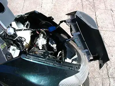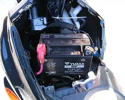 The battery is positioned at the front of the bike under the instrument panel. To access the battery for replacement or jump starting requires only a Phillips screw-driver and the removal of a few panels. The battery the bike ships with tends to work well for around 3 years in most situations, after which initially difficulty may be experienced with cold starts, and eventually starting becomes unreliable. Replacements are easily sourced from most Motorbike service outlets. As this bike has no kick start, it is advisable to ensure the battery is in good condition at all times.