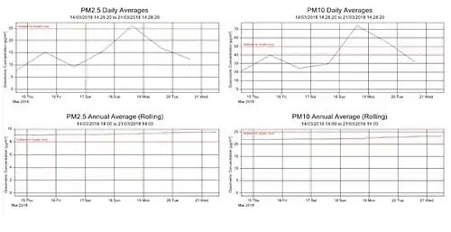 As part of the underground works, air quality mechanisms constructed to help redistribute the air from within the tunnels to above ground. This is important because of potential health implications that come with prolonged exposure. Air quality is defined by the concentration of particulate matter (PM) in the air. PM10 identifies particulate matter 10 micrometres or less in diameter whereas PM2.5 concerns matter that are 2.5 micrometres[12]. Air safety standards in NSW are as follows: