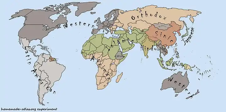 Source: Samuel P. Huntington, The Clash of Civilizations and the Remaking of World Order, Simon & Schuster, 1996. Some minor or cleft civilizations have been added by the author