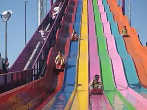 Ramps and slides are one common example of the inclined plane. Ramps enable accessing heights that would be too difficult to scale vertically. Chutes and slides allow people and things to be safely lowered from a height. Eliminating friction from a slide increases the maximum speed at which an object can move down the slide. Because of this, slides are one of the most common and popular forms of entertainment and are common on playgrounds all over the world. In the sport skiing, participants accelerate to extremely high speeds utilizing only the inclined plane of a mountain slope provided by nature.