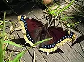 ![]() Nymphalis antiopa, the mourning cloak butterfly. Adult pictured. |