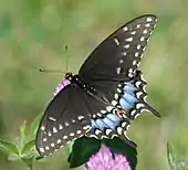 ![]() Battus philenor, the pipevine swallowtail. Adult pictured. |