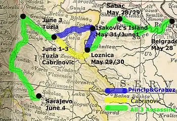 In Loznica, Princip and Grabež fell out with Čabrinović, who they believed to have been constantly failing to ensure security. As a result, he gave all his weapons to the other two members of the group and traveled to Tuzla alone (see illustration).