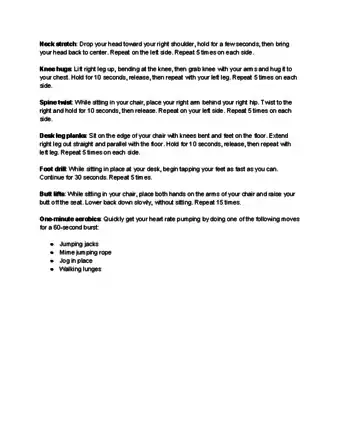 3Take an exercise break. You don't need a gym or running shoes to put a little exercise in your day. Try chair exercises and other small exercises you can do comfortably at your desk. Spend 10 – 15 minutes on your lunch break doing doing these activities to help break the routine of sitting and limit the unhealthy effects of sitting so long. There are many sites online that offer ideas for exercising in your chair.[5]