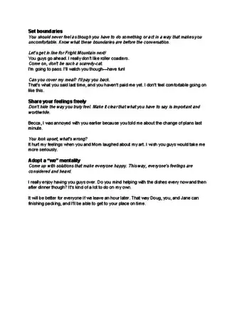 1Understand assertive communication. Assertive communication carries respect for the feelings, needs, wants, and opinions of others. An assertive communicator avoids infringing upon the rights of others, while asserting their own, seeking compromise in the process. Assertive communication utilizes actions and words to express boundaries of needs and wants in a calm fashion, while conveying a message of confidence.[1]