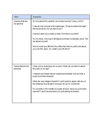 • Avoid talking about problems in your life or other negative situations. If you've experienced people's eyes glazing over when such topics are raised, it's simply because few people expect to have to deal with heavy situations or problems in a casual, conversational context.