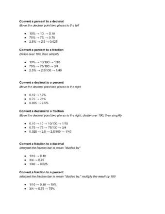 Converting numbers between percents, fractions, and decimals is a necessary basic math skill. The concepts are quite simple once you learn them. Not only will knowing how to convert small numbers help you on your test, but it is also useful for financial calculations.