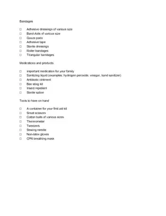 • Record amounts (10 small bandages, for example) and expiration dates (for medications or ointments) next to the listed items on the checklist you include in your kit.