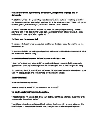 • Try to use “I” statements instead of casting blame. For example, you could say “I feel like you take for granted how often I help you with work projects, even though we don’t work for the same company.”[9]