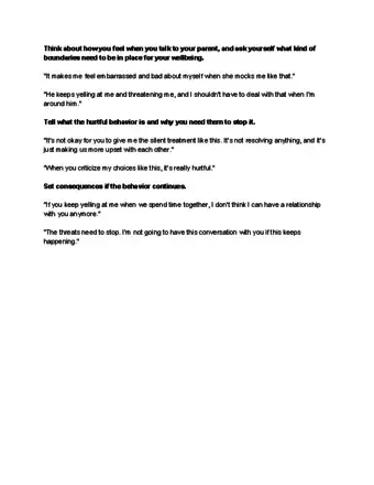 - For example, if your parent accuses you of being ungrateful for everything they do and is trying to argue with you about it, say something like, “I have already told you that I appreciate you. There’s no reason for us to argue about that.”