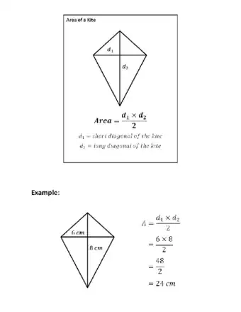 - Multiply the lengths of the 2 diagonal lines and divide by 2 to find the area of a rhombus or kite.