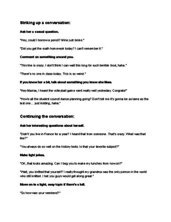- Try asking her a question or for a small favor as a way of striking up a conversation. For instance, if you're in class, you could say something like, “Hi, I'm Jess. Do you have a pencil I can borrow?”