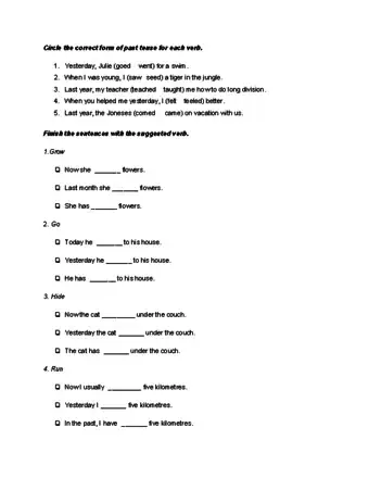 • Other verbs change the vowel to an "e" in the past tense and/or add "wn" in the past participle. Examples include "flow-flew-flown," "draw-drew-drawn," "show-showed-shown," and "grow-grew-grown."