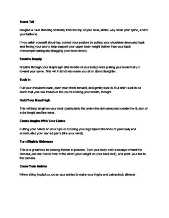 1Use good posture. Standing with proper posture will pull in your tummy and make you look easily 10 pounds lighter or more. Keep your back straight and your shoulders back. Sometimes this can be very uncomfortable, if you're used to standing with poor posture, but it can make a huge difference visually.