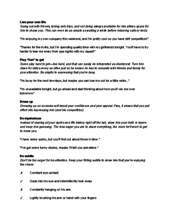 2Play hard to get. As trite as this sounds, it is effective. It doesn't mean withholding sex, although that can be part of it. In modern practice it just means that you aren't always available when he asks you on a date or to hang out together. Even if you have no plans, don't agree to see him every time he calls you.