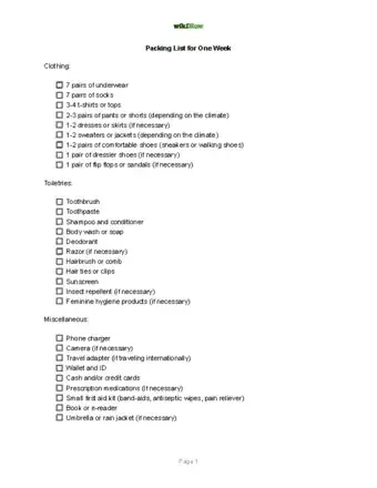 Pack 5 tops and 2-3 bottoms for a 7-day trip. Start with at least 1 jacket or layering piece, and bring more layers if your destination will be chilly.[3] X Research source Then, take a look at the activities you’ve planned. If you’ll be going out for a date night or attending a formal event, add in a nice shirt or dress, as well as your formal shoes. Here’s a sample checklist of what you need to pack for a week-long trip: