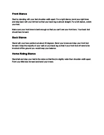 2Start with the ready stance. The stances above are fighting stances. However, at the beginning of any spar, you'll need to begin with the ready stance. You have three basic options:[7]