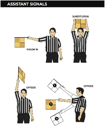 Watch for substitutions. If the assistant holds his flag above his head with both hands, he is indicating to the referee that a substitution is being performed and that play should not be started until it is finished.[4]