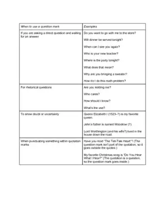 Question marks are a form of punctuation that indicate a question. In their simplest form, they're used at the end of direct questions that often start with words like "who," "what," or "why." When you're using question marks along with quotes, it depends on what's being said or asked within the quotation marks as to where the question mark goes. Question marks can even be used to split up a sentence to replace commas.