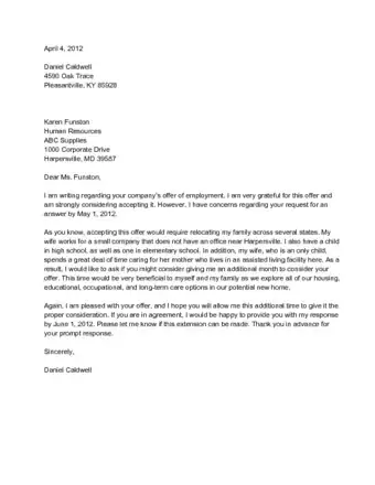 - If you have multiple reasons for your request, choose the best one and focus on it. For example, if you are delaying a job offer you might want to tell them that you would like to conduct additional research into the transfer costs (if this is indeed true) instead of letting them know that you are also waiting on another offer.[9]