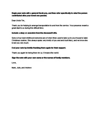- If you are especially close to the person you’re thanking, feel free to include a personal anecdote or story from the deceased’s life, if you share one with whomever you’re thanking. Personalizing your thank you notes is always a nice touch, but certainly don’t feel that you must do this.