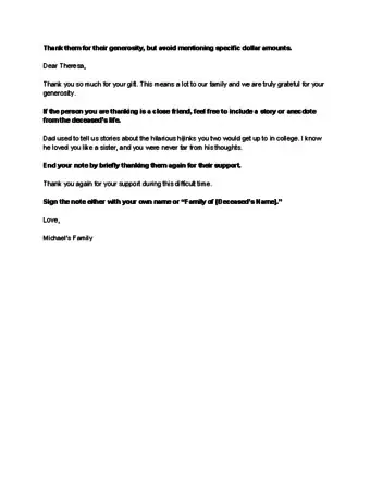 - ↑ https://condolencemessages.com/funeral-thank-you-notes-what-to-say/#4-what-to-say-thank-you-note-for-funeral-donations-or-money-
