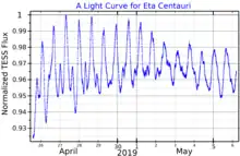 As a Be star,[11] it has variable emissions in its hydrogen spectral lines. This emission can be modelled by a decretion disk of gas that has been ejected from the star by its rapid rotation and now follows a near-Keplerian orbit around the central body.[12] Its brightness is also slightly variable, and it is classified as a Gamma Cassiopeiae variable star with multiple periods of variability.[3] The International Variable Star Index lists Eta Centauri as both a Gamma Cassiopeiae variable and a Lambda Eridani variable with variations caused by its rotation and pulsations.[13]