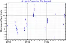 Chi Aquarii, Latinized from χ Aquarii, is the Bayer designation of a star in the equatorial constellation of Aquarius. The distance to this star, based upon parallax measurements with a 7% margin of error, is roughly 610 light-years (190 parsecs). It is visible to the naked eye with an apparent visual magnitude of about 5.