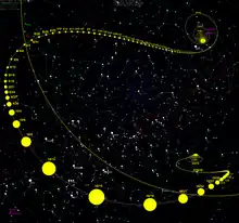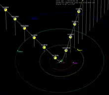 On the outward leg of its journey through the Solar System, ʻOumuamua passed beyond the orbit of Earth on 14 October with a closest approach distance of approximately 0.16175 AU (24,197,000 km; 15,036,000 mi) from Earth.[7] On 16 October it moved back north of the ecliptic plane and passed beyond the orbit of Mars on 1 November.[78][59][7] It passed beyond Jupiter's orbit in May 2018, beyond Saturn's orbit in January 2019, and beyond Neptune's in 2022.[78] As it leaves the Solar System it will be approximately right ascension 23'51" and declination +24°45', in Pegasus.[10] It will continue to slow down until it reaches a speed of 26.33 kilometres per second (94,800 km/h; 58,900 mph) relative to the Sun, the same speed it had before its approach to the Solar System.[10]