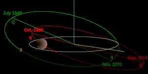 Like Pluto, Ixion's orbit is elongated and inclined to the ecliptic.[39] Ixion has an orbital eccentricity of 0.24 and an orbital inclination of 19.6 degrees, slightly greater than Pluto's inclination of 17 degrees.[2][39] Over the course of its orbit, Ixion's distance from the Sun varies from 30.1 AU at perihelion (closest distance) to 39.8 AU at aphelion (farthest distance).[2] Although Ixion's orbit is similar to that of Pluto, their orbits are oriented differently: Ixion's perihelion is below the ecliptic whereas Pluto's is above it (see right image). As of 2019, Ixion is approximately 39 AU from the Sun and is currently moving closer, approaching perihelion by 2070.[2] Simulations by the Deep Ecliptic Survey show that Ixion can acquire a perihelion distance (qmin) as small as 27.5 AU over the next 10 million years.[4]