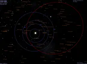 1999 CW8 is an Apollo asteroid that crosses Earth's orbit. It orbits the Sun at a distance of 0.9–3.6 AU once every 3 years and 4 months (1,221 days; semi-major axis of 2.24 AU). Its orbit has an eccentricity of 0.60 and an inclination of 34° with respect to the ecliptic.[2] The asteroid never approaches Earth closer than 0.2 AU in the foreseeable future, but occasionally makes close approaches to Mars of 0.07 AU. It makes one such approach in 2073, at 0.067 AU, and another one in 2103, at 0.094 AU. Due to 1999 CW8's relatively high inclination, although it passes closer to the Sun than the Earth (0.9 AU), it never comes closer than 0.2 AU.