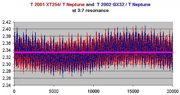 The orbital period of both 2002 GX32 and 2001 XT254 around the 3:7 (2.333) resonance of Neptune.