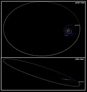 2012 VP113 is the minor planet with the farthest known perihelion (closest approach to the Sun) in the Solar System, greater than Sedna's.[13] Though its perihelion is farther, 2012 VP113 has an aphelion only about half of Sedna's. It is the second discovered sednoid, with semi-major axis beyond 150 AU and perihelion greater than 50 AU. The similarity of the orbit of 2012 VP113 to other known extreme trans-Neptunian objects led Scott Sheppard and Chad Trujillo to suggest that an undiscovered object, Planet Nine, in the outer Solar System is shepherding these distant objects into similar type orbits.[10]