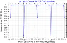 YZ Cassiopeiae (21 Cas) is a star system 103.8 parsecs (339 ly) away from Earth, in the constellation Cassiopeia. It comprises three stars: an eclipsing Algol-type binary and a visually fainter star about 3000 AU distant.[10]