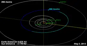 Aeolia (minor planet designation: 396 Aeolia) is a typical main belt asteroid. It was discovered by the French astronomer Auguste Charlois on 1 December 1894 from Nice, and may have been named for the ancient land of Aeolis.[5] The asteroid is orbiting the Sun at a distance of 2.74 AU with a period of 4.54 years and an eccentricity (ovalness) of 0.16. The orbital plane is inclined at an angle of 2.5° to the plane of the ecliptic.[3] This is the largest member of the eponymously named Aeolia asteroid family, a small group of asteroids with similar orbits that have an estimated age of less than 100 million years.[6]