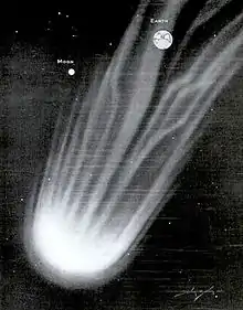 7P/Pons–Winnecke (also known as Comet Pons–Winnecke) is a periodic Jupiter-family comet with a six-year orbit. Early calculations for the 1921 apparition suggested that the orbit of the comet might collide with Earth in June, but observations on 10 April ruled out an impact.[6] It made a very close approach to Earth in June 1927.[7] The outward migration of perihelion created impressive meteor showers in 1916, 1921 and 1927.[8]