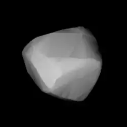 Lightcurve inversion also modeled the body's shape and poles. In 2013, modelling by an international study using photometric data from the US Naval Observatory, the Uppsala Asteroid Photometric Catalogue, the Palomar Transient Factory and the Catalina Sky Survey gave a concurring sidereal period of 5.07478±0.00002 hours and two spin axes at (218.0°, 34.0°) and (53.0°, 41.0°) in ecliptic coordinates (λ, β). The body's very elongated shape had already been indicated by the relatively high brightness variation measured during the direct photometric observations.[5][14]
