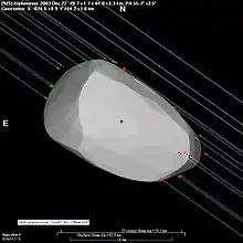 In 2003, stellar occultation measured a diameter of 59.2 kilometres and deduced an albedo of 0.218,[11] while the modelling of asteroid occultation silhouettes gave a diameter of 58 kilometres.[8] The asteroid has been observed in stellar occultations 8 times since 2003.[22]
