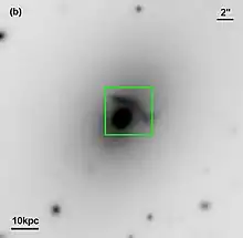 In 2023, a follow-up study[3] of higher resolution images with greater signal-to-noise ratio, using lens modelling techniques, strongly supported the presence of a central supermassive black hole and provided a lower as well as an upper limit and an upward revision of its mass to (3.27±2.12)×1010 M☉. If correct, this would be the first identification and mass determination of a supermassive black hole using analysis of a gravitational lens, a method the authors suggest could be useful for the discovery of more supermassive black holes at higher redshift, i.e., outside the local universe, which previously has been limited to actively accreting black holes.[3]