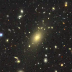 The BCG also acts as a gravitational lens, bending the light of a more distant background galaxy (at redshift 0.451) into an apparent tangential arc about 6 kpc to one side.[1] This makes the galaxy an important case in investigations of the intrinsic properties of dark matter.