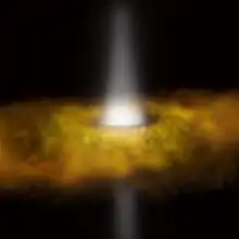 An accretion disk is a structure (often a circumstellar disk) formed by diffuse material[lower-alpha 1] in orbital motion around a massive central body. The central body is most frequently a star. Friction, uneven irradiance, magnetohydrodynamic effects, and other forces induce instabilities causing orbiting material in the disk to spiral inward toward the central body. Gravitational and frictional forces compress and raise the temperature of the material, causing the emission of electromagnetic radiation. The frequency range of that radiation depends on the central object's mass. Accretion disks of young stars and protostars radiate in the infrared; those around neutron stars and black holes in the X-ray part of the spectrum. The study of oscillation modes in accretion disks is referred to as diskoseismology.[1][2]