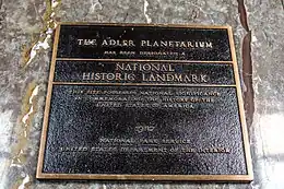 The Adler Planetarium opened to the public on May 12, 1930.[3] Its architect, Ernest A. Grunsfeld Jr., was awarded the gold medal of the Chicago chapter of the American Institute of Architects in 1931 for its design.[4] In 1987, it was declared a National Historic Landmark.[2][5]
