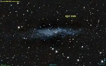 NGC 3109 is the largest and dominant member of this group, with a diameter of 41,700 light-years, almost half the diameter of the Milky Way.[2] It was the first discovered member of the group, discovered in 1835. It is also second closest to Earth, at a distance of 4.348 million light-years away. It was thought to be an irregular galaxy, but is now theorized to possibly be a barred spiral. It seems to be a galaxy with no central core. Based on spectroscopy of blue supergiants in NGC 3109, it is known that the galaxy has a low metallicity, similar to that to the Small Magellanic Cloud.[3] It is one of the most metal-poor galaxies in the Local group, if it is included.[4] NGC 3109 seems to contain an unusually large number of planetary nebulae for its luminosity.[5] It also contains a substantial amount of dark matter.[6]