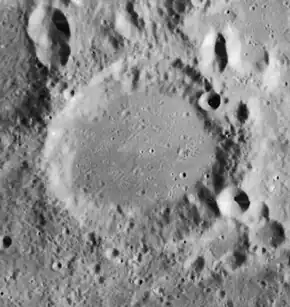 The outer wall of the crater has been worn and eroded by subsequent impacts, and a pair of small craterlets overlay the rim to the southeast and northeast. The central crater is 63 kilometers in diameter and 2,080 meters deep.[1] The craterlet on the southeast rim, Apianus B, is a member of a cluster of co-joined craterlets that includes Apianus T and Apianus U. The interior floor of the central crater is relatively smooth and lacks a central peak, although the surface appears somewhat convex. Only a few tiny craterlets mark the surface.[3]