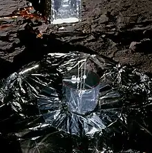 The ALSEP experiments left on the Moon by Apollo 12 were connected to a Central Station, which contained a transmitter, receiver, timer, data processor, and equipment for power distribution and control of the experiments.[51] The equipment was powered by SNAP-27, a radioisotope thermoelectric generator (RTG) developed by the Atomic Energy Commission. Containing plutonium, the RTG flown on Apollo 12 was the first use of atomic energy on a crewed NASA spacecraft—some NASA and military satellites had previously used similar systems. The plutonium core was brought from Earth in a cask attached to an LM landing leg, a container designed to survive re-entry in the event of an aborted mission, something NASA considered unlikely.[52] The cask would survive re-entry on Apollo 13, sinking in the Tonga Trench of the Pacific Ocean, apparently without radioactive leakage.[53]