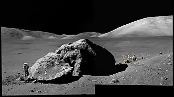 The HFE had been flown on the aborted Apollo 13 mission, as well as on Apollo 15 and 16, but placed successfully only on Apollo 15, and unexpected results from that device made scientists anxious for a second successful emplacement. It was successfully deployed on Apollo 17.[69] The lunar gravimeter was intended to detect wavers in gravity, which would provide support for Albert Einstein's general theory of relativity;[70] it ultimately failed to function as intended.[71] The LACE was a surface-deployed module that used a mass spectrometer to analyze the Moon's atmosphere.[72] On previous missions, the Code Cathode Gauge experiment had measured the quantity of atmospheric particles, but the LACE determined which gases were present: principally neon, helium and hydrogen.[68] The LSPE was a seismic-detecting device that used geophones, which would detect explosives to be set off by ground command once the astronauts left the Moon.[67] When operating, it could only send useful data to Earth in high bit rate, meaning that no other ALSEP experiment could send data then, and limiting its operating time. It was turned on to detect the liftoff of the ascent stage, as well as use of the explosives packages, and the ascent stage's impact, and thereafter about once a week, as well as for some 100 hour periods.[73] The LEME had a set of detectors to measure the characteristics of the dust particles it sought.[67] It was hoped that the LEME would detect dust impacting the Moon from elsewhere, such as from comets or interstellar space, but analysis showed that it primarily detected dust moving at slow speeds across the lunar surface.[74]