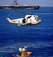 Flight directors were Gerry Griffin, first shift, Gene Kranz and Neil B. Hutchinson, second shift, and Pete Frank and Charles R. Lewis, third shift.[30] According to Kranz, flight directors during the program Apollo had a one-sentence job description, "The flight director may take any actions necessary for crew safety and mission success."[31] Capsule communicators (CAPCOMs) were Fullerton, Parker, Young, Duke, Mattingly, Roosa, Alan Shepard and Joseph P. Allen.[32]