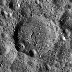 The crater wall and interior have been heavily eroded by many subsequent impacts, leaving the features rounded and irregular. A pair of craters lie across the southwestern rim, and two small craterlets lie along the eastern rim. The interior floor is irregular and contains many tiny craterlets.