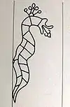 Paper C is the oldest used in the manuscript.[11] Its watermark depicts a rather thick snake, resembling the stance and curvature of a seahorse, with its head bent beyond the axis towards the margin, while its tail points in the opposite direction, although its end is also directed towards the margin.[11] On the snake's head, there is a fleur-de-lis resembling a crown, and a tongue protrudes from its mouth directed upwards and ending in a blade-shaped tip.[11] The snake's body is divided by a dorsal line into two parts, which are further divided into segments by oblique horizontal lines descending downwards.[11] In Charles Briquet's catalogue, the most similar watermark is cataloged as number 10,738.[13][14]