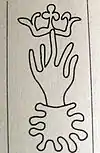 Paper D contains a watermark depicting a hand protruding from a cross with 9 pinnacles, with fingers raised upwards and spread out, placed beneath a crown.[13] This paper is of inferior quality.[15] Analysis of watermarks on similar paper has shown its origin from the town of Tulle in France, dating back to the years 1523 and 1526.[15] Presumably, this paper reached Copernicus through the Netherlands, similar to paper C.[15] In Charles Briquet's catalogue, the most similar watermarks are cataloged as number 10,944[15][16] and 10,946.[16]